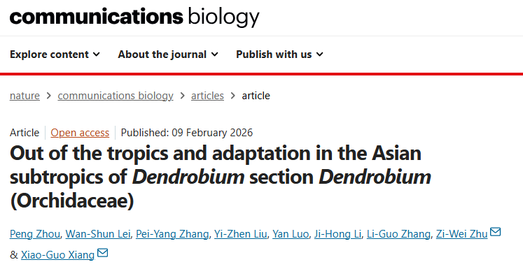 近日,南昌大学向小果研究员课题组在 Nature 系列期刊Communications Biology上发表了题为“Out of the tropics and adaptation in the Asian subtropics of Dendrobium section Dendrobium (Orchidaceae)”(https://doi.org/10.1038/s42003-026-09670-3) 的最新研究成果。该研究以附生兰石斛组植物为研究对象,系统解析了其从亚洲热带向亚热带扩散的时空动态、宏观进化规律及形态适应模式,为理解植物“走出热带”的适应性进化提供了全新的典型案例。